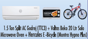 3 1.5 Ton Split AC Godrej TTC3 + Voltas Beko 20 Ltr Solo Microwave Oven + Herclules E Cycle Montra Hypno Plus
