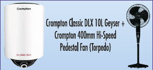 2 Crompton Classic DLX 10L Geyser + Crompton 400mm Hi-Speed Pedestal Fan (Torpedo)