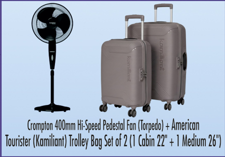 3 Crompton 400mm Hi-Speed Pedestal Fan (Torpedo) + American Tourister Trolley Bag - Set of 2 (1 Cabin + 1 Medium)