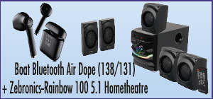 2 Boat Bluetooth Air Dope 138 131 + Zebronics-Rainbow 100 5 1 Hometheatre